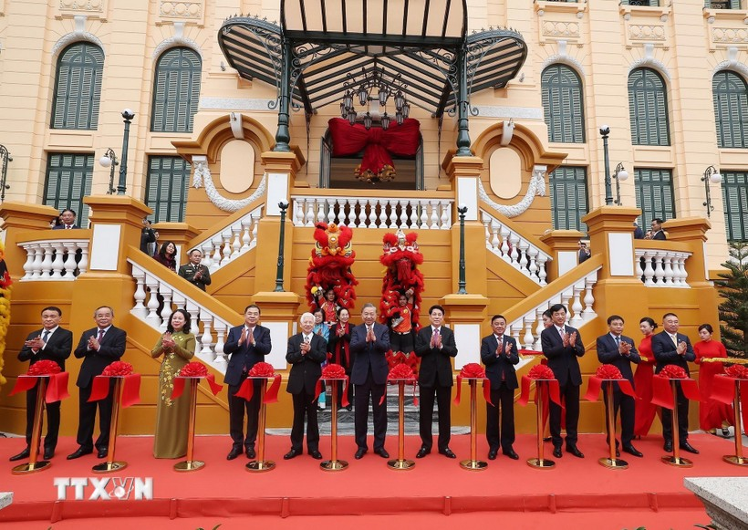 Tổng Bí thư Tô Lâm và Chủ tịch nước Lương Cường cùng các đồng chí lãnh đạo, nguyên lãnh đạo Đảng, Nhà nước đã thực hiện nghi thức cắt băng khánh thành công trình Trụ sở làm việc Cơ quan Chủ tịch nước.
