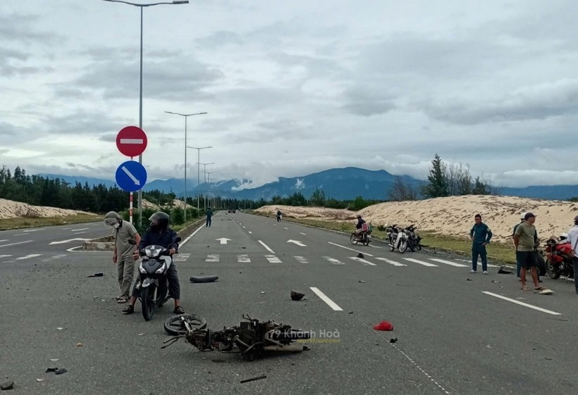 Cú đâm trực diện mạnh giữa hai xe máy trên đoạn đường dẫn vào Khu kinh tế Vân Phong khiến một người tử vong tại chỗ, người còn lại bị thương nặng, đã được người dân đưa đi cấp cứu ngay sau đó.