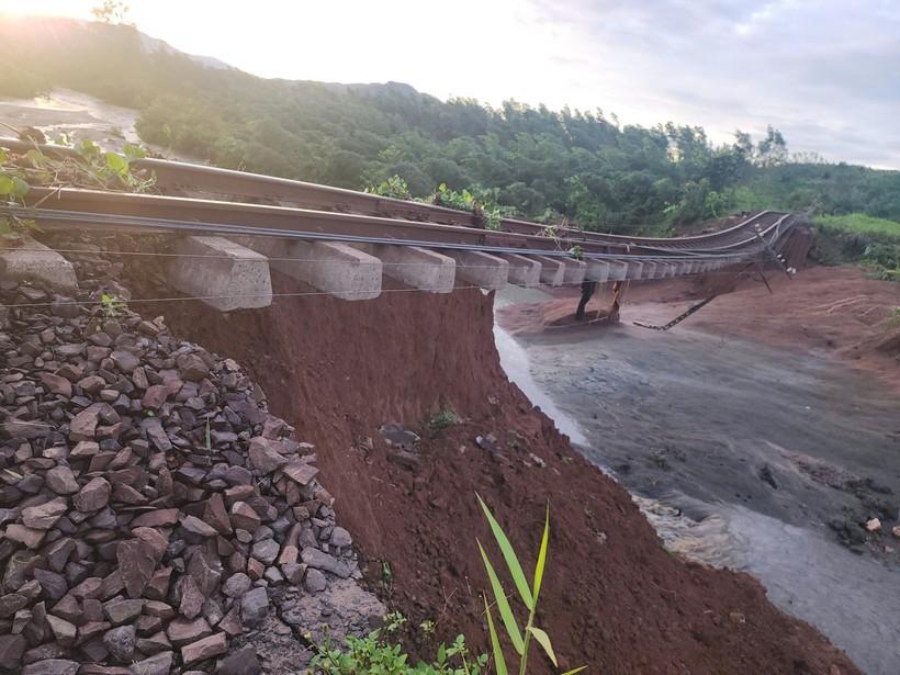 Bão số 13 làm trôi nền đường sắt, có đoạn ray “treo lơ lửng” độ cao 9m