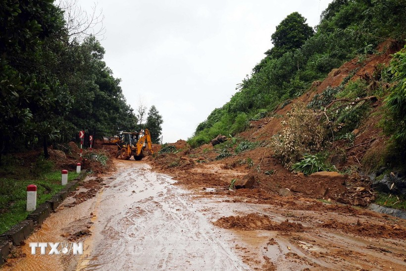 Mưa lớn kéo dài làm đất đá sạt lở tại Km12 trên tuyến cao tốc La Sơn-Túy Loan, đoạn qua địa bàn thành phố Huế, khiến các phương tiện lưu thông qua đây không an toàn.