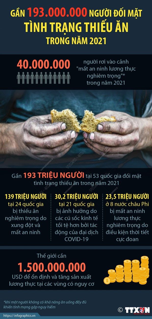 Theo Tổ chức Lương Nông Liên hợp quốc (FAO), số người đối mặt với tình trạng thiếu ăn đã tăng lên 193 triệu người trong năm 2021 do xung đột, biến đổi khí hậu và khủng hoảng kinh tế.