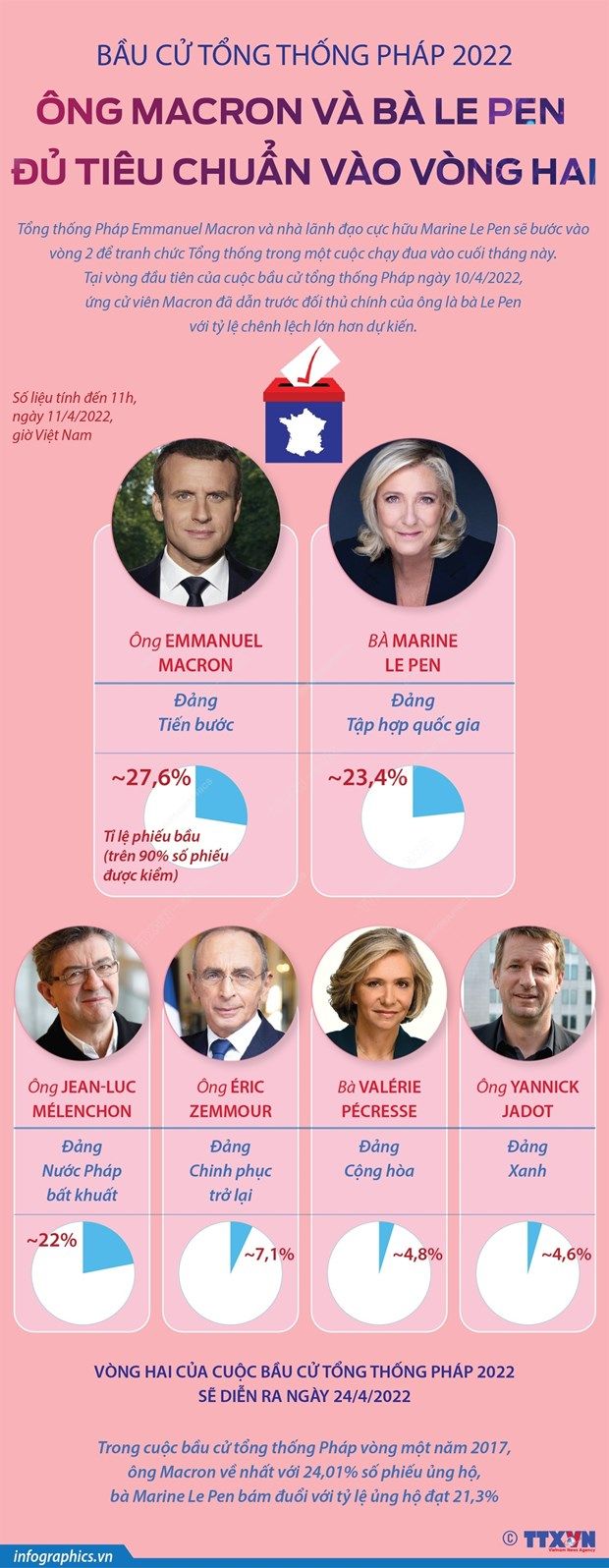 Tại vòng đầu tiên của cuộc bầu cử Tổng thống Pháp tổ chức vào ngày 10/4, ứng cử viên Emmanuel Macron đã dẫn trước đối thủ chính - bà Le Pen - với tỷ lệ chênh lệch lớn hơn dự kiến.
