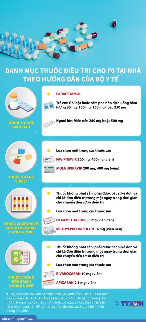 Hướng dẫn của Bộ Y tế nêu rõ các trường hợp F0 điều trị tại nhà sẽ được kê các thuốc hạ sốt, giảm đau, kháng virus.