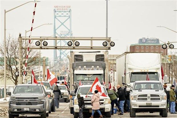 "Đoàn xe Tự do" của các lái xe tải Canada đã chặn cầu Ambassador (nối Detroit, Michigan, với Windsor, Ontario) vào đầu tuần này, và khiến hai cửa khẩu nhỏ hơn phải đóng cửa.