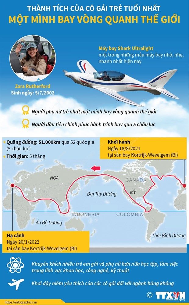 Zara Rutherford đã trở thành người phụ nữ trẻ nhất một mình bay vòng quanh thế giới, đồng thời là người đầu tiên chinh phục hành trình bay qua 5 châu lục trong 5 tháng trên chiếc máy bay siêu nhẹ.