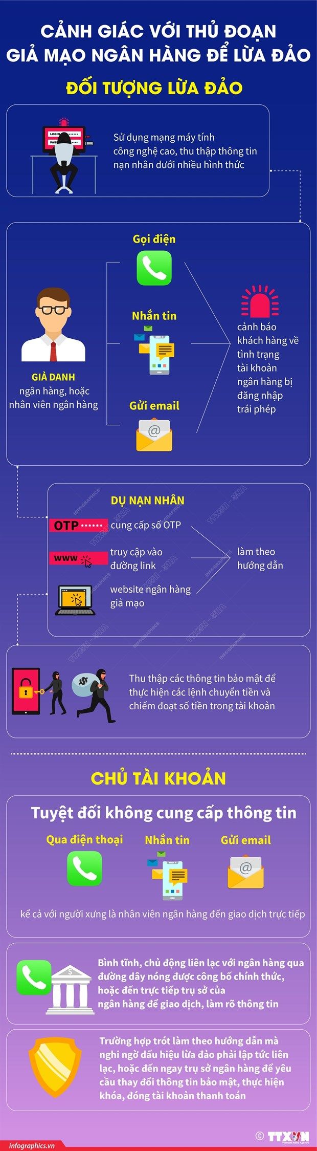 [Infographics] Cảnh giác với thủ đoạn giả mạo ngân hàng để lừa đảo
