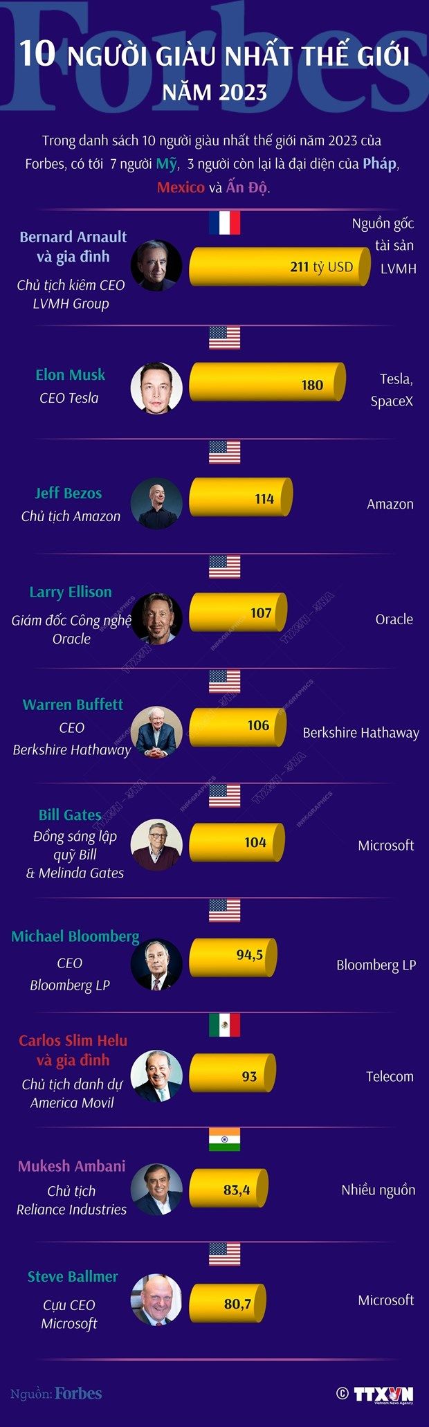 Trong danh sách 10 người giàu nhất thế giới năm 2023 của Forbes, có tới 7 người Mỹ, 3 người còn lại là đại diện của Pháp, Mexico và Ấn Độ.