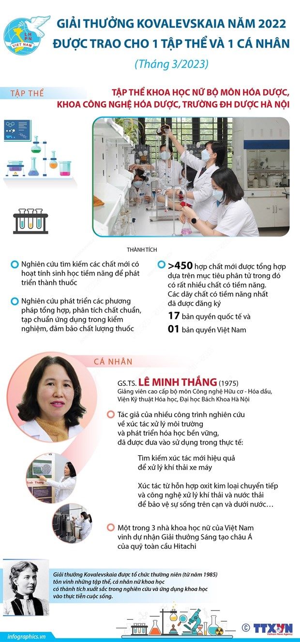 Giải thưởng Kovalevskaia được trao cho tập thể khoa học nữ (Bộ môn Hóa dược, Trường Đại học Dược Hà Nội); Giáo sư-Tiến sỹ Lê Minh Thắng - Giảng viên Viện Kỹ thuật Hóa học, Đại học Bách Khoa Hà Nội.