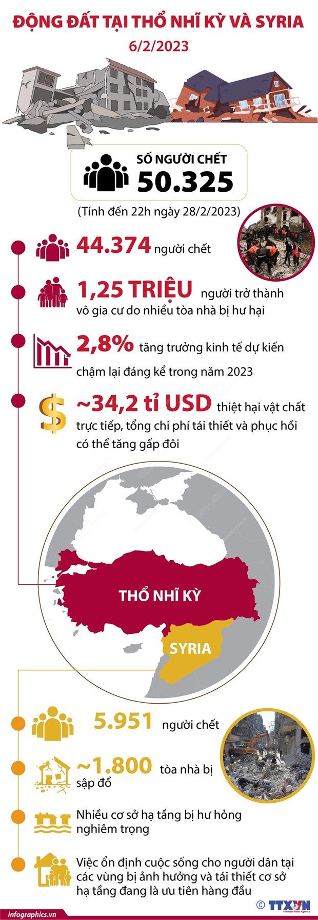 Tính đến 22 giờ Việt Nam ngày 28/2, số người thiệt mạng trong trận động đất làm rung chuyển Thổ Nhĩ Kỳ và Syria hôm 6/2 đã tăng lên 50.325 người.
