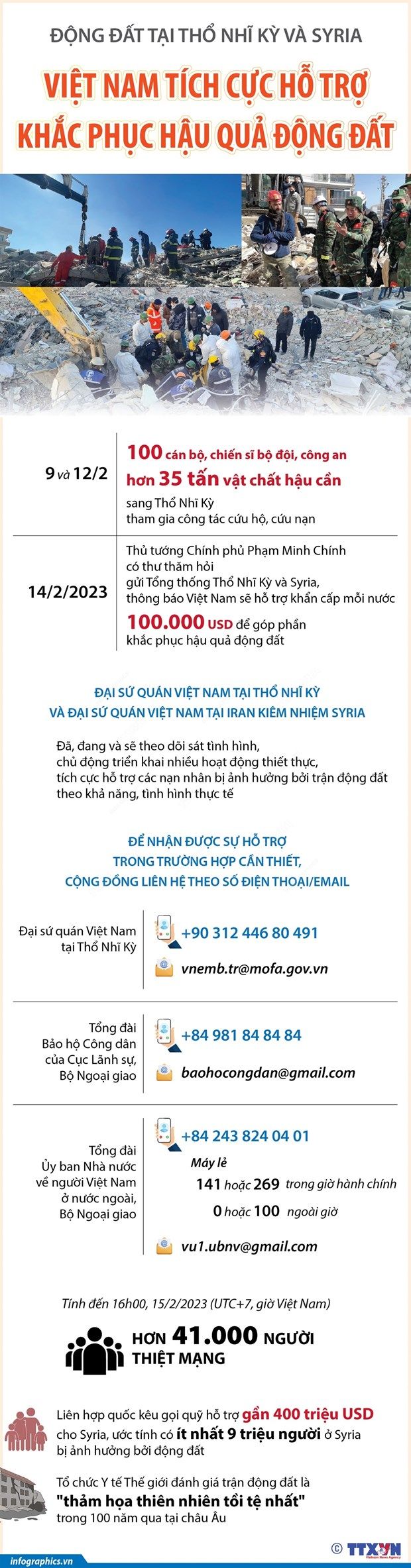 Ngày 15/2, Đoàn cứu hộ cứu nạn của Quân đội nhân dân Việt Nam tham gia hỗ trợ khắc phục hậu quả động đất tại tỉnh Hatay, Thổ Nhĩ Kỳ tiếp tục triển khai lực lượng thực hiện nhiệm vụ.
