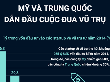 Các startup về vũ trụ thu hút khoảng 265 tỷ USD vốn đầu tư kể từ năm 2014, trong đó các công ty Mỹ chiếm gần 50%, các công ty Trung Quốc chiếm khoảng 30%.