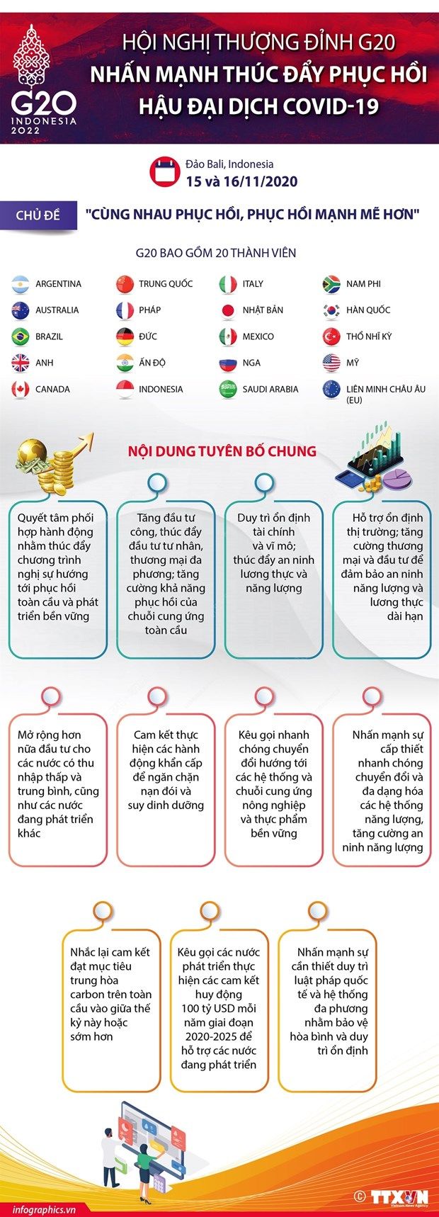 Ngày 16/11, Hội nghị thượng đỉnh G20 tại Bali (Indonesia) đã ra Tuyên bố của các nhà lãnh đạo, trong đó nhấn mạnh các nỗ lực chung và biện pháp phục hồi trong giai đoạn hậu đại dịch COVID-19.