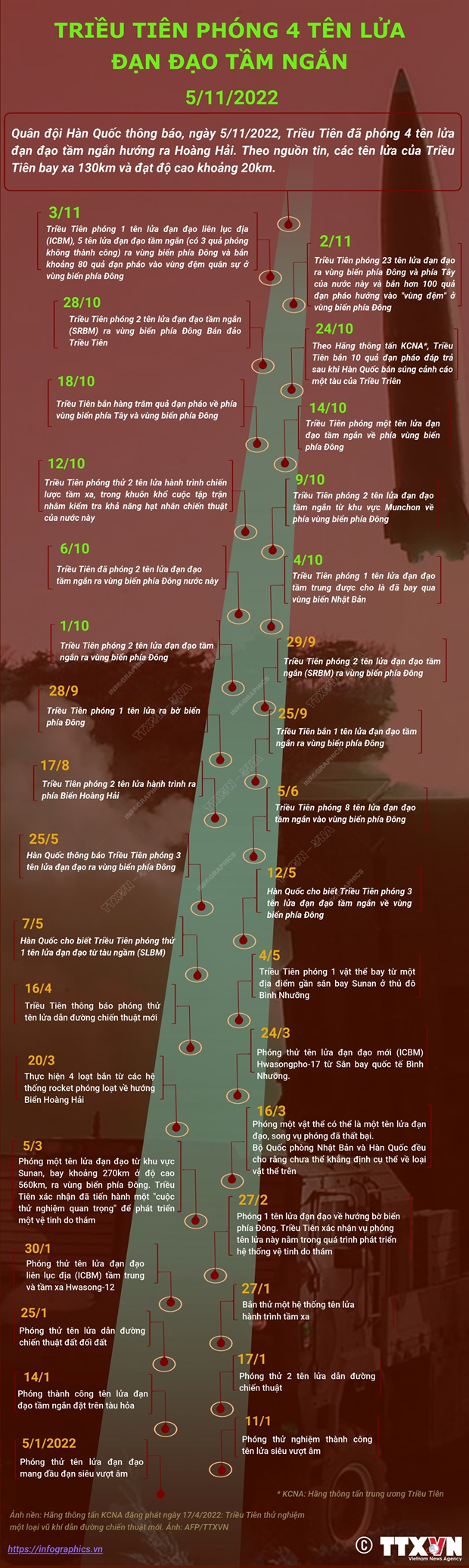 Quân đội Hàn Quốc thông báo, ngày 5/11/2022, Triều Tiên đã phóng 4 tên lửa đạn đạo tầm ngắn hướng ra Hoàng Hải. Các tên lửa của Triều Tiên bay xa 130km và đạt độ cao khoảng 20km.