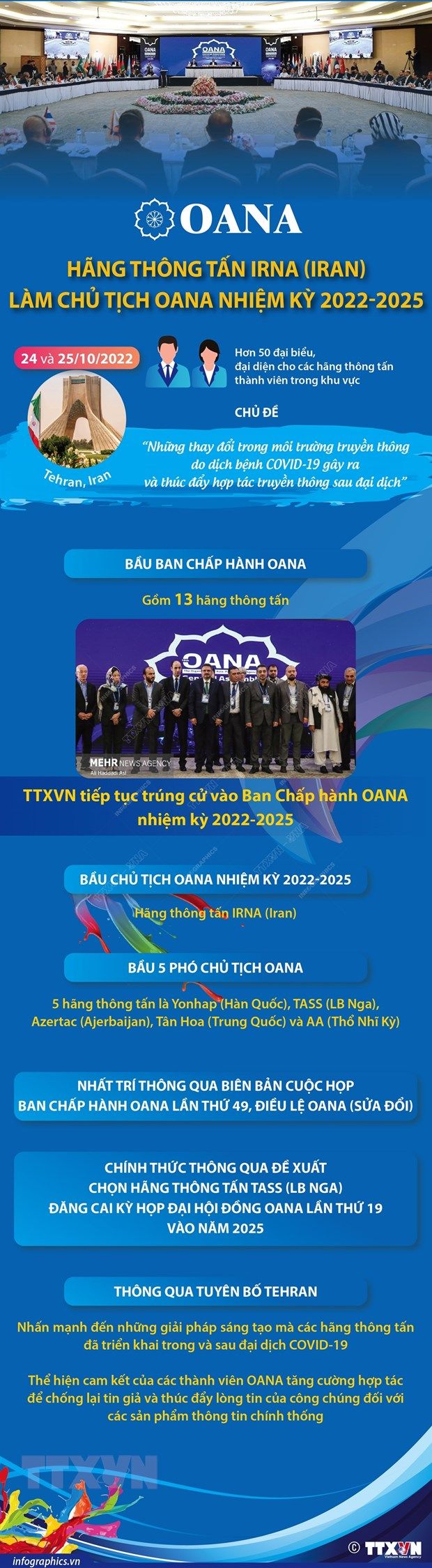 Ngày 25/10, tại Tehran (Iran), Đại hội đồng lần thứ 18 của Tổ chức các hãng thông tấn châu Á-Thái Bình Dương (OANA) đã bế mạc, bầu hãng thông tấn IRNA của Iran làm Chủ tịch OANA nhiệm kỳ 2022-2025.