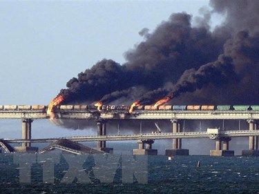 Một chiếc xe tải đã phát nổ trên cầu Kerch vào sáng sớm ngày 8/10, gây ra vụ cháy bảy bồn téc chở nhiên liệu của một đoàn tàu đi trên tuyến đường sắt của cầu.
