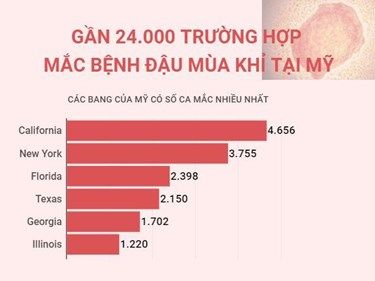 Bang California là nơi có nhiều ca mắc đậu mùa khỉ được xác nhận nhất trong số các bang của Mỹ với 4.656 trường hợp, tiếp theo là New York (3.755 trường hợp), Florida (2.398 trường hợp)