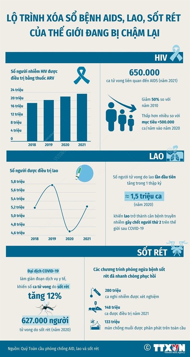 Sau khi chịu hưởng nặng nề bởi đại dịch COVID-19, những nỗ lực chống AIDS, lao và sốt rét đã bắt đầu phục hồi, song thế giới với chưa quay lại đúng lộ trình để có thể xóa bỏ hoàn toàn các bệnh này.