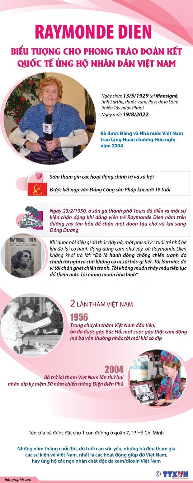 Ngày 19/8/2022, bà Raymonde Dien - đảng viên Đảng Cộng sản Pháp, một biểu tượng của tinh thần chống cuộc chiến phi nghĩa do thực dân Pháp tiến hành ở Việt Nam - đã qua đời ở tuổi 93.