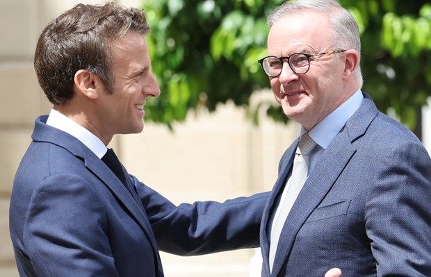 Tổng thống Pháp Emmanuel Macron đã bắt tay nồng nhiệt với Thủ tướng Australia Anthony Albanese bên ngoài Điện Elysee, trước khi tiến vào trong để hội đàm.