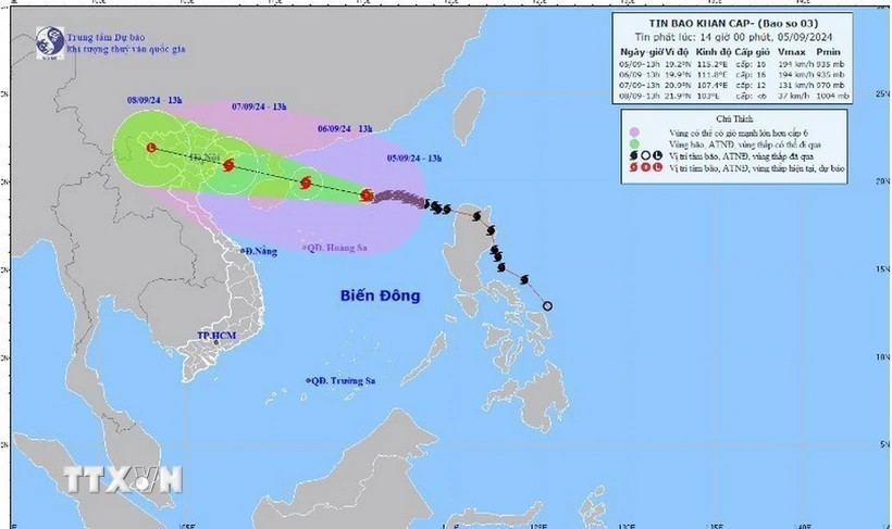 Hồi 14 giờ ngày 5/9, vị trí tâm bão ở vào khoảng 19,3 độ Vĩ Bắc; 115,1 độ Kinh Đông; sức gió mạnh nhất cấp 16, giật trên cấp 17; trong 3 giờ tới, bão di chuyển theo hướng Tây Tây Bắc, tốc độ 10km/h.