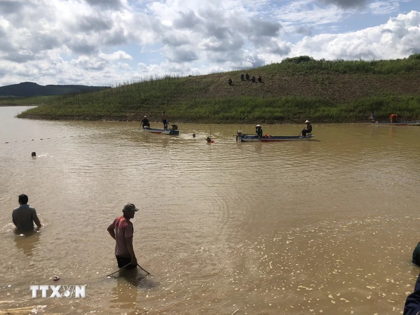 Cháu T.H.H.P (7 tuổi) và cháu T.H.M.V (10 tuổi) trượt chân rơi xuống lòng hồ Plei Krong, chị Hoàng Thị Nhẫn, mẹ cháu T.H.H.P, đang mang bầu 6 tháng, lao xuống cứu nhưng cũng đuối nước.