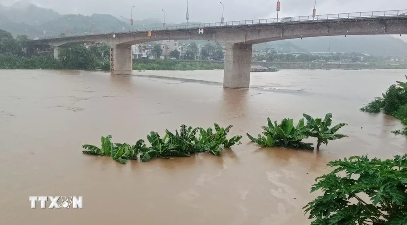 Theo Đài khí tượng thủy văn tỉnh Lào Cai, lúc 7 giờ ngày 31/7, dòng nước lũ đục ngầu và chảy xiết, cuốn theo nhiều củi rác trôi về rải rác khắp mặt sông Hồng và vẫn tiếp tục dâng cao.
