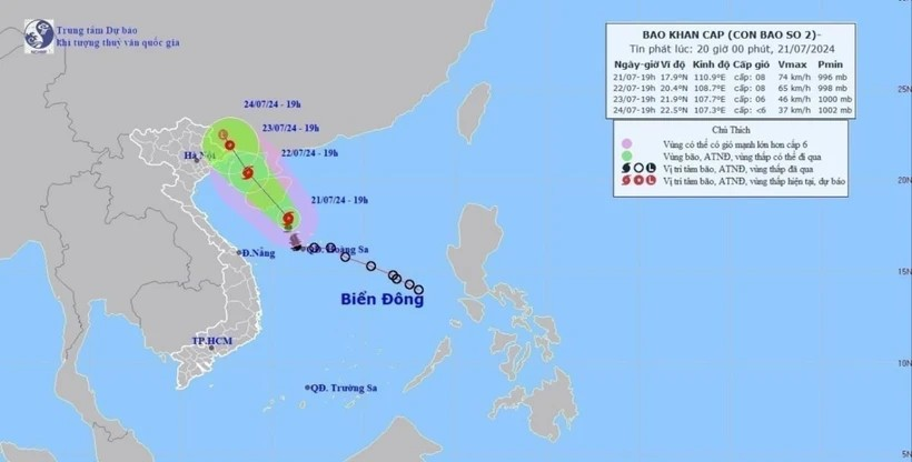 Dự báo đến 4h ngày 23/7, bão số 2 di chuyển theo hướng Tây Bắc với tốc độ từ 10-15 km/h đi vào vịnh Bắc Bộ; sức gió mạnh nhất vùng gần tâm bão mạnh cấp 8, giật cấp 10.