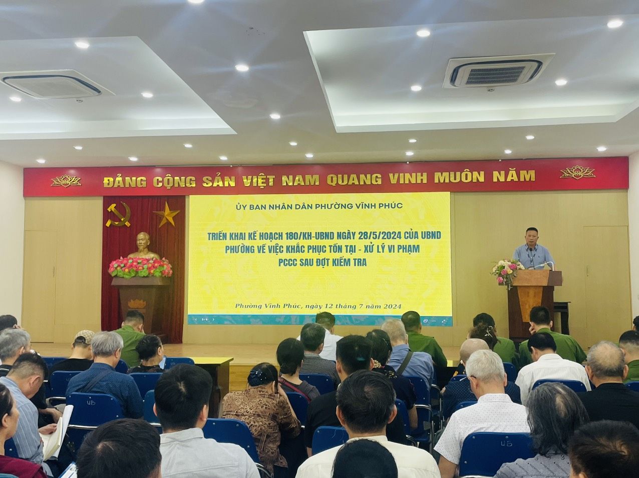 Sáng ngày 12/7 vừa qua, UBND phường Vĩnh Phúc, quận Ba đình, Hà Nội tiếp tục quán triệt triển khai kế hoạch số 180/KH-UBND ngày 23/5/2024 của UBND phường về việc khắc phục tồn tại PCCC sau đợt kiểm tra toàn diện tổng thể trên địa bàn phường.
