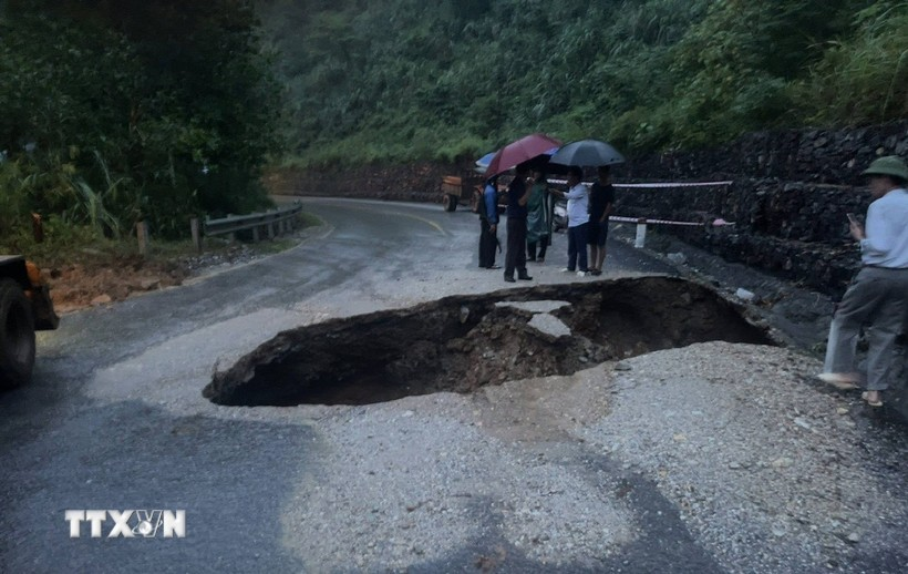 Hố sụt lún có diện tích ước tính khoảng 50m2 và độ sâu lên tới 8 đến 10m, phần mặt đường còn lại chỉ vẻn vẹn 1,5m, gây gián đoạn hoàn toàn giao thông qua khu vực.