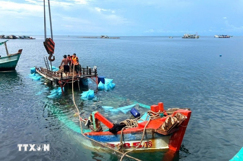 Tàu cá cùng 3 thuyền viên bị sóng lớn đánh chìm cách đảo Hòn Chuối khoảng 3 hải lý. Nhờ sự phối hợp của lực lượng biên phòng và ngư dân, các thuyền viên được cứu an toàn, tàu cá được lai dắt vào bờ.