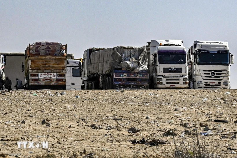 2.000 xe tải chở hàng viện trợ nhận đạo đang bị mắc kẹt tại cửa khẩu biên giới Rafah phía Ai Cập, giữa lúc người Palestine ở Dải Gaza đang thiếu thốn các hàng hóa thiết yếu.