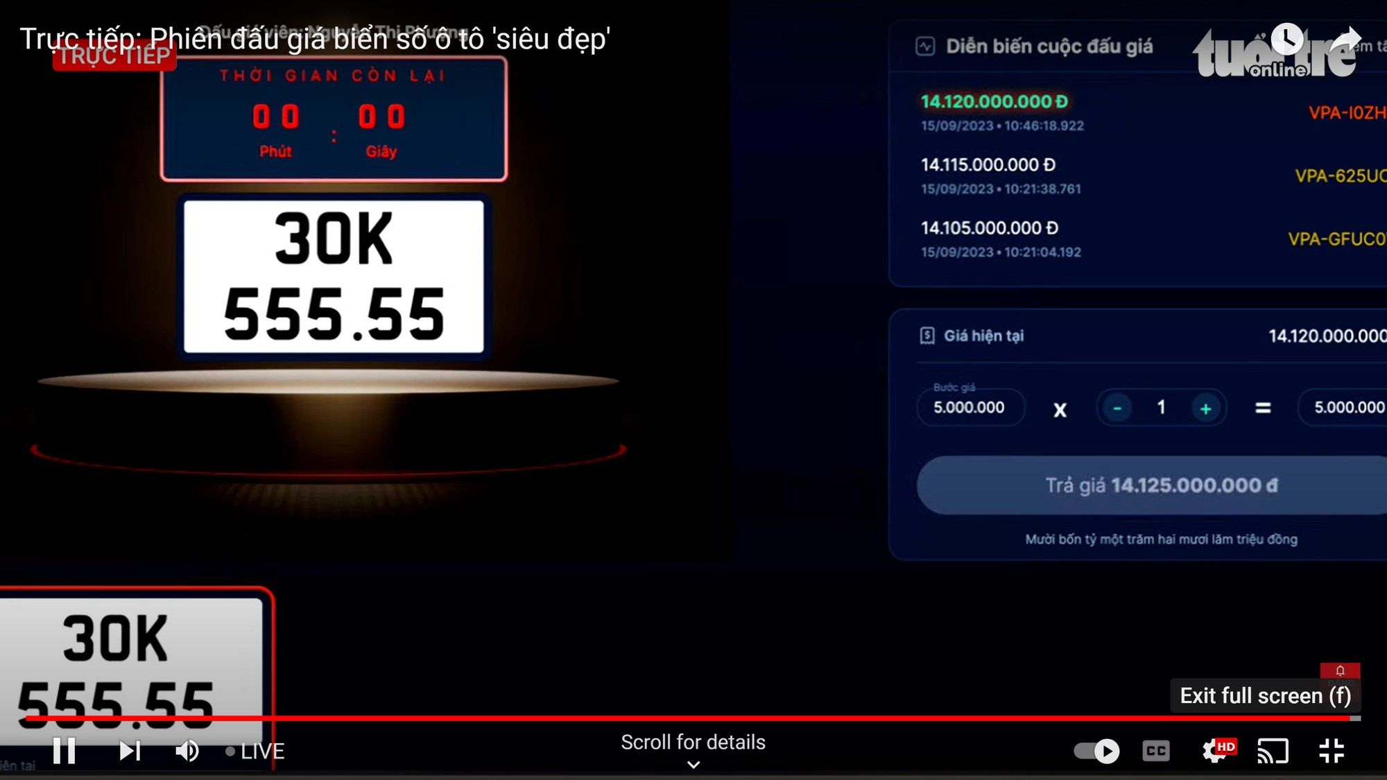 Hà Nội: Biển số ngũ quý 30K - 555.55 trúng đấu giá trên 14 tỷ đồng