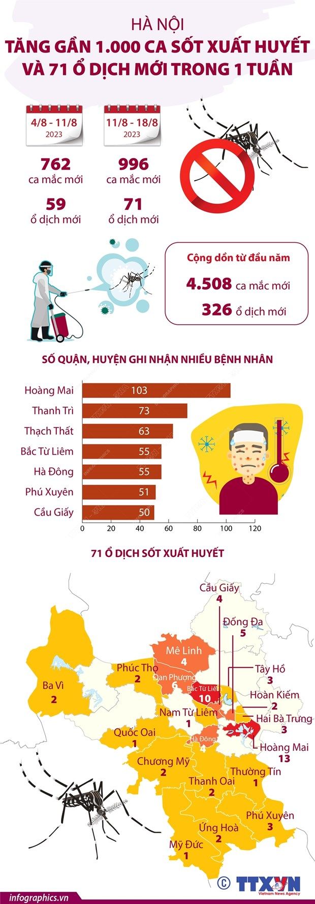 Chỉ trong một tuần, (từ ngày 11 đến 18/8/2023), trên địa bàn Hà Nội ghi nhận 71 ổ dịch mới, 996 ca mắc sốt xuất huyết tại 30 quận, huyện, thị xã, tăng 234 ca so với tuần trước đó, cao nhất từ đầu năm.