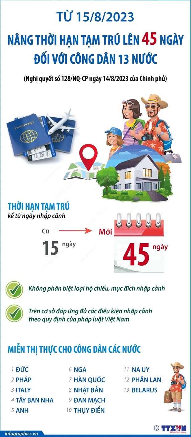 Theo Nghị quyết số 128/NQ-CP ngày 14/8/2023 của Chính phủ, từ 15/8/2023, thời hạn tạm trú đối với công dân 13 nước tại Việt Nam được nâng từ 15 ngày lên 45 ngày.