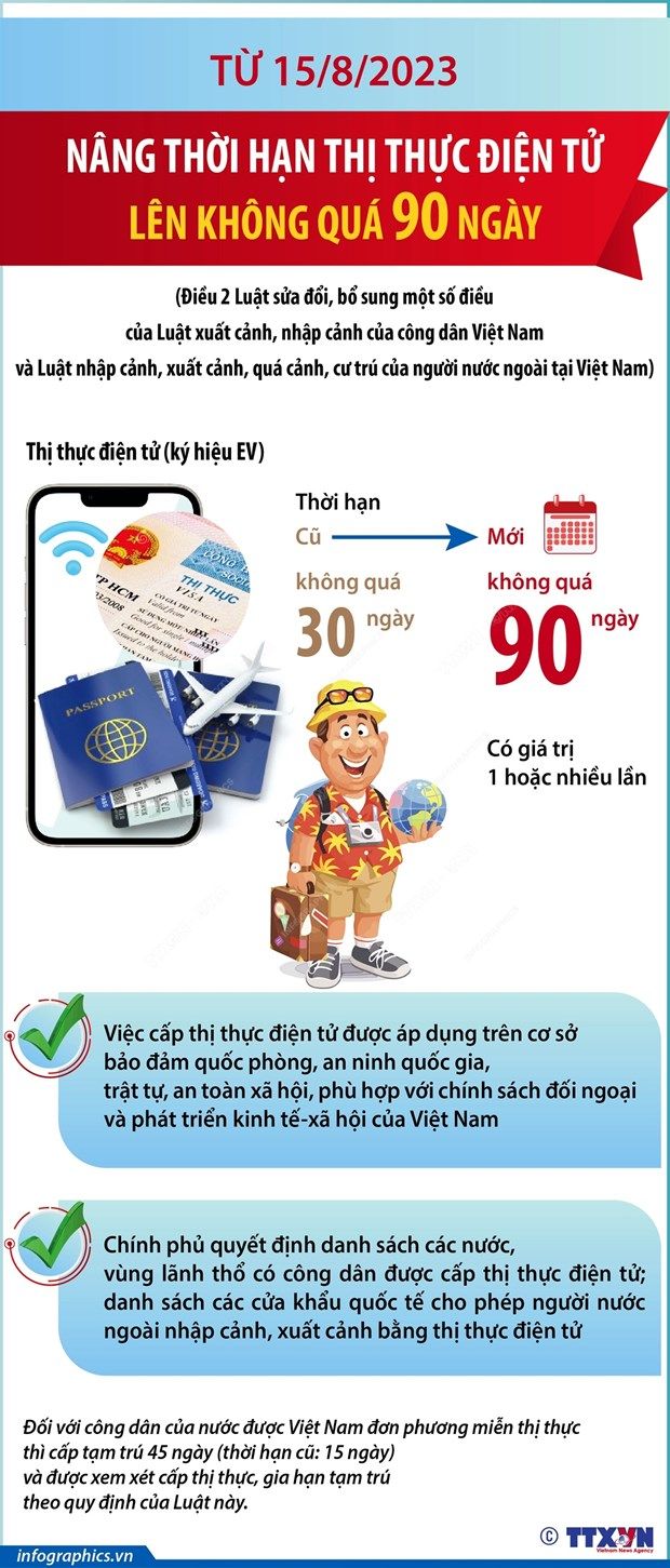 Từ ngày 15/8/2023, thời hạn thị thực điện tử (hay visa điện tử, ký hiệu EV) được nâng lên từ không quá 30 ngày thành không quá 90 ngày và có giá trị 1 lần hoặc nhiều lần.