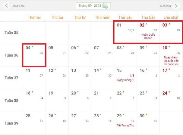 Dịp nghỉ lễ Quốc khánh 2/9 năm nay, cán bộ, công chức, viên chức và người lao động được nghỉ 4 ngày liên tiếp, từ ngày 1/9/2023 đến hết ngày 4/9/2023.