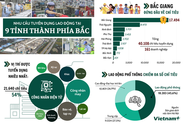 21.640 là số công nhân điện tử mà các doanh nghiệp tại 9 tỉnh thành phía Bắc cần tuyển dụng, chiếm 54% tổng chỉ tiêu tại phiên giao dịch việc làm tháng 7/2023.