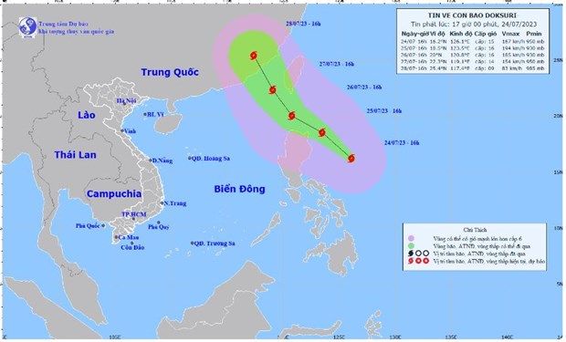 Ngày và đêm 25/7, nhiều khu vực trên cả nước có nắng nóng, có nơi nắng nóng gay gắt, chiều tối và đêm có mưa rào và dông vài nơi; trong khi bão Doksuri có khả năng mạnh lên trong 24-48 giờ tới.
