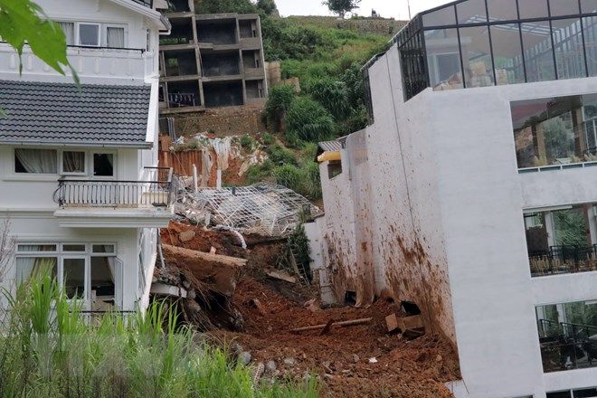 Mưa lớn làm vỡ bờ kè bêtông từ trên cao, đất đá tràn xuống 4 ngôi nhà phía dưới trong khu vực hẻm 36, đường Hoàng Hoa Thám, phường 10, thành phố Đà Lạt, làm hai ngôi nhà bị phá hủy hoàn toàn.