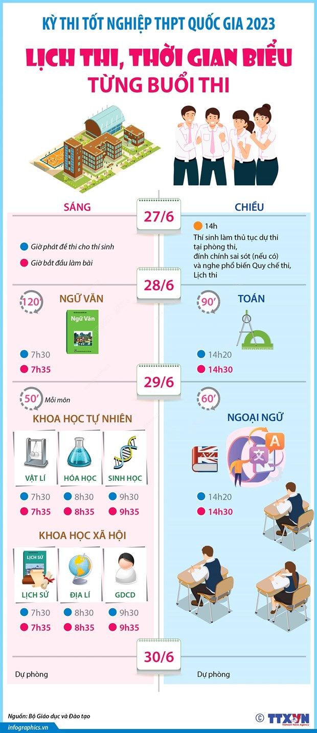 Sáng 28/6, thí sinh thi Ngữ văn, chiều cùng ngày thí sinh thi Toán. Sáng 29/6, thí sinh làm bài thi Tổ hợp, chiều cùng ngày thí sinh thi Ngoại ngữ, ngày 30/6 là ngày thi dự phòng.