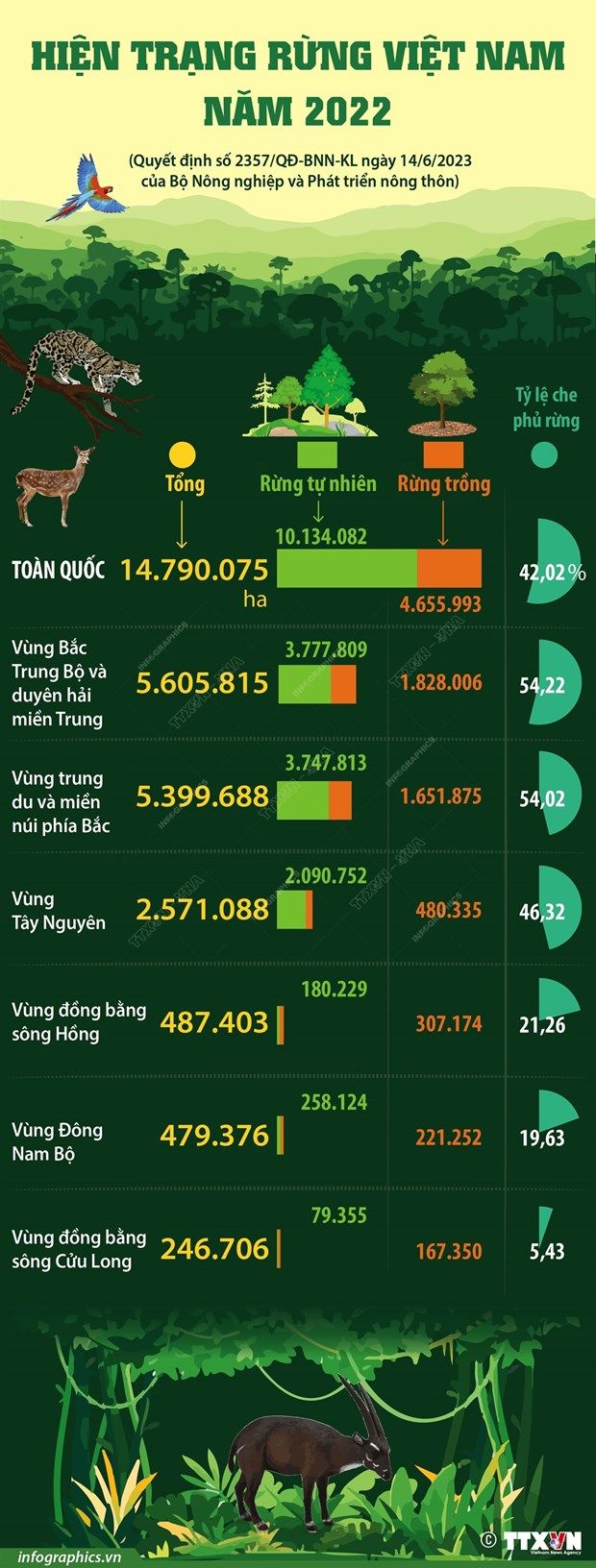 Tính đến ngày 31/12/2022, diện tích rừng của cả nước bao gồm cả rừng trồng chưa khép tán là 14.790.075 ha, trong đó, rừng tự nhiên là 10.134.082 ha; tỷ lệ che phủ toàn quốc là 42,02%.