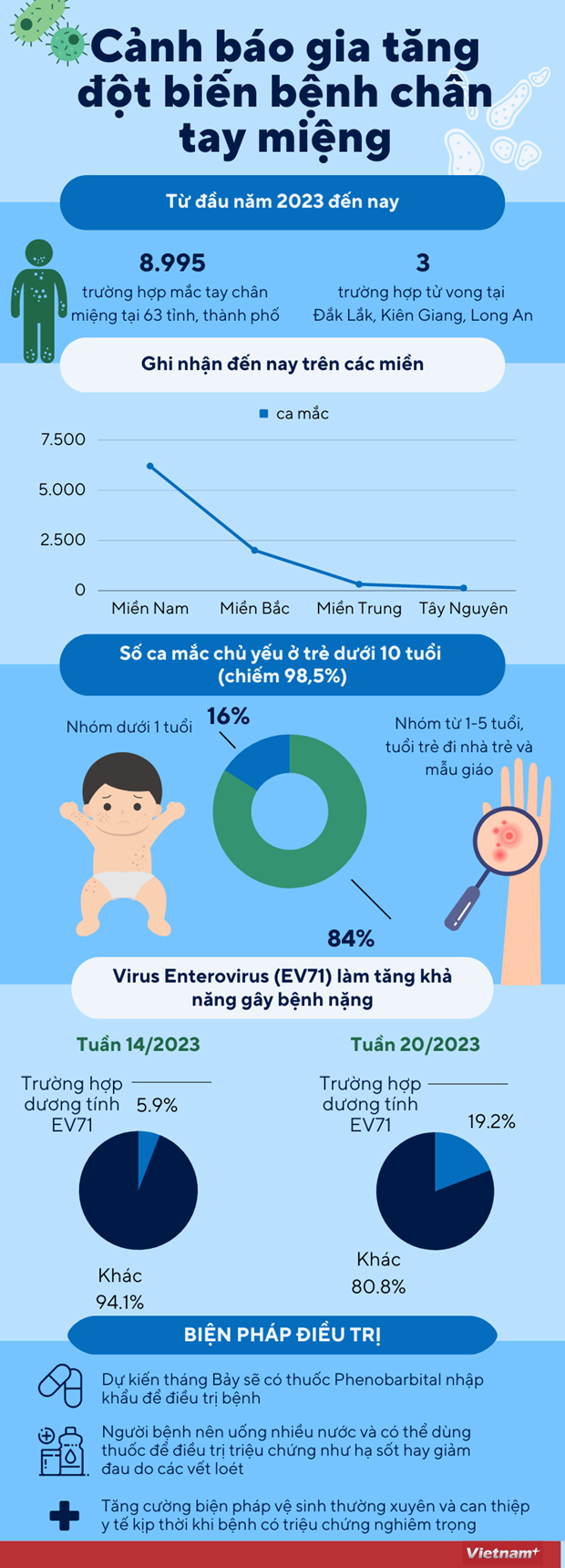 [Infographics] Cảnh báo gia tăng đột biến các ca bệnh chân tay miệng
