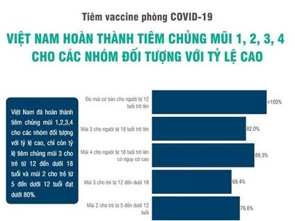 Theo số liệu của Bộ Y tế, đến nay, Việt Nam đã hoàn thành tiêm chủng mũi 1, 2, 3, 4 cho các nhóm đối tượng với tỷ lệ cao.