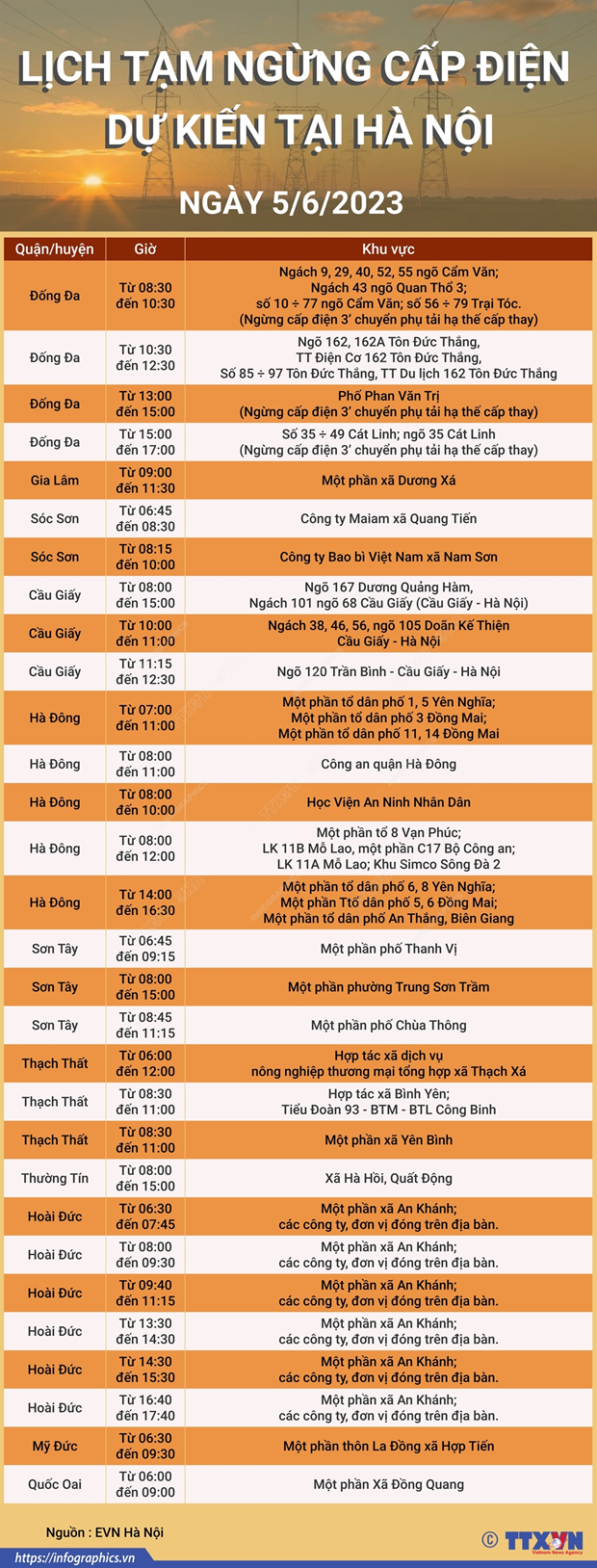 Lịch tạm ngừng cấp điện dự kiến tại Hà Nội trong ngày 5/6
