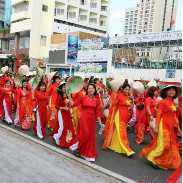 Hơn 6.000 người mặc áo dài truyền thống và cách tân với nón lá diễu hành trên đường phố TP Nha Trang để chào mừng sự kiện Festival biển Nha Trang 2023.