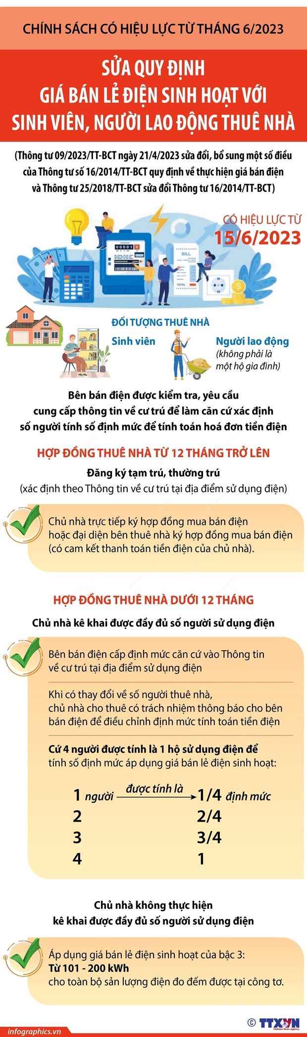 Theo Thông tư số 09/2023/TT-BCT ngày 21/4/2023 của Bộ Tài chính, từ ngày 15/6/2023, giá bán lẻ điện sinh hoạt với sinh viên, người lao động thuê nhà có sự điều chỉnh.
