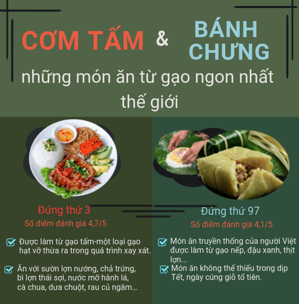 Hai món ẩm thực Việt Nam vinh dự có mặt trong danh sách 100 món ăn ngon nhất thế giới được làm từ gạo năm 2023 là cơm tấm ở vị trí thứ 3 và bánh chưng ở vị trí thứ 97.