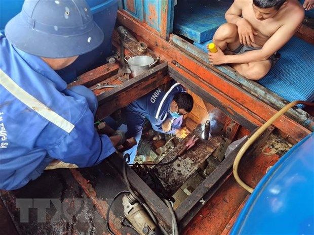 Nhân viên kỹ thuật của Trung tâm dịch vụ hậu cần-kỹ thuật đảo Trường Sa (thuộc Hải đoàn 129 Hải quân) đã hỗ trợ ngư dân khắc phục sự cố hỏng máy, giúp tàu nhanh chóng ra khơi.