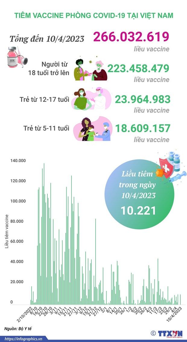 Trong ngày 10/4 có 10.221 liều vaccine phòng COVID-19 được tiêm tại Việt Nam, nâng tổng số liều vaccine đã được tiêm trên cả nước tính đến thời điểm này là 266.032.619 liều.