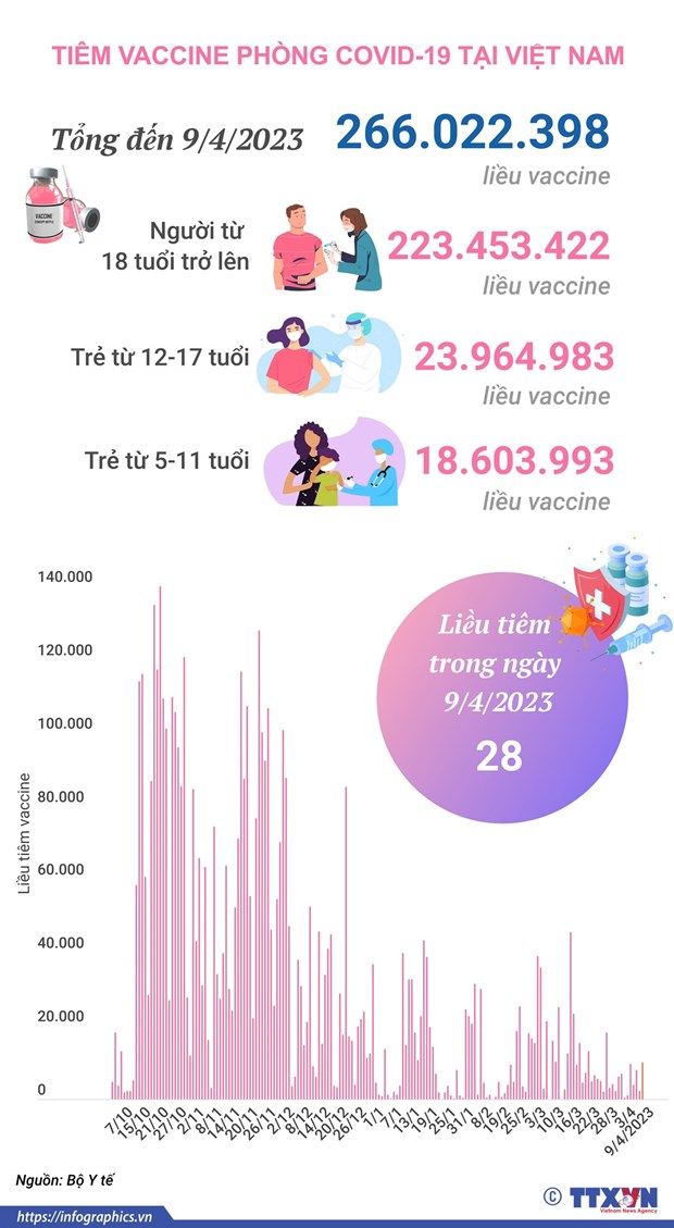 Tổng số liều vaccine đã được tiêm tại Việt Nam đến hết ngày 9/4 là 266.022.398 liều; trong đó tiêm cho trẻ từ 5-11 tuổi là 18.603.993 liều, tiêm cho trẻ từ 12-17 tuổi là 23.964.983 liều.